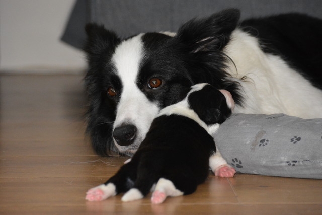 Miután elfolyt a magzatvíz, az első kiskutya sehogy se akart megszületni, úgyhogy elmentünk orvoshoz. Az ultrahangon láttuk, hogy minden rendben a picikkel, így a rendelőben is vártunk még 1-1,5 órát, hátha kibújik, de nem, az orvos végül a császármetszés mellett döntött. Este 10 körül lettek meg a kicsik, 4kan és 1 szuka, egészségesek és gyönyörűek.:)