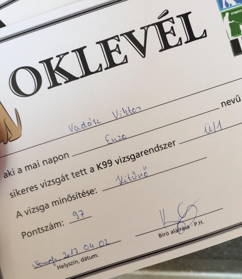 Enzo (Daring Action at Sylvan Moonlight) a kölyöktanfolyam lezárásaként két remek vizsgát tett ma. Az alapfokú engedelmes vizsgán (E1) jól megfelelt minősítést, az ügyességi 1-es (Ü1) vizsgán pedig 97 (100-ból) pontos kitűnő minősítést kapott. Enzo még csak 7,5 hónapos, csak így tovább! :)