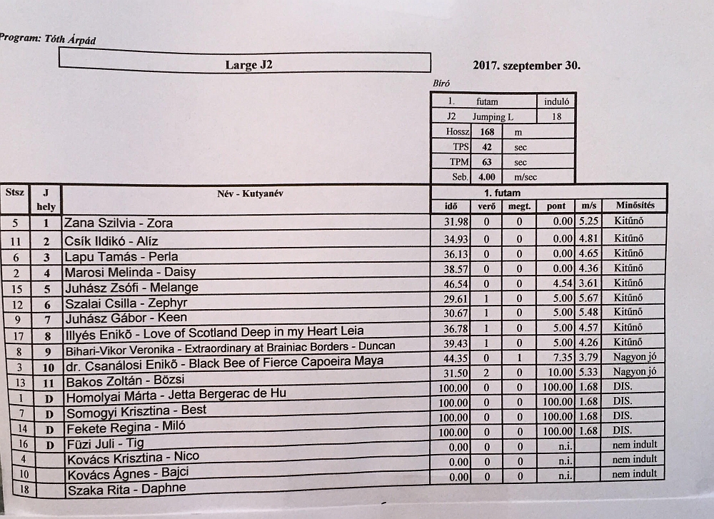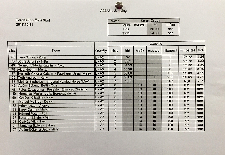 TordasZoo Őszi Muri agility versenyen Zorával összevont A2-A3 jumpingban hibátlan futammal 1. helyezettek lettünk (19-ből). Az A2-es futamunk DIS lett. Videó az A2-A3 jumping futamunkról.