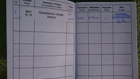 Szilvával (Blizzak Oth Road at Sylvan Moonlight) körülbelül 1 éve kezdtek készülni a kezdő obedience vizsgára. A sok gyakorlás és a kitartó munka eredménye egy sikeres, kitűnő minősítésű vizsga.