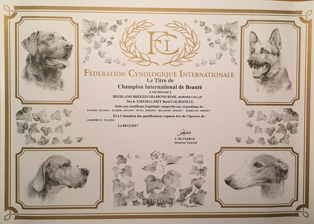 Belgiumból megérkezett Zora International Champion C.I.B. oklevele, mától hivatalosan viselheti a neve előtt e címet.